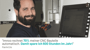 Bereits durften wir darüber berichten , wie Patrik Erb Imnoo bei der Kalkulation beispielsweise von CNC-Drehteilen sowie -Frästeilen erfolgreich einsetzt. Dennoch war zu Beginn etwas Geduld gefragt. Geduld, die Angebots-App von Imnoo, mit zuverlässigen Nachkalkulationsdaten (reale Maschinenlaufzeiten) aus der Produktion zu speisen.